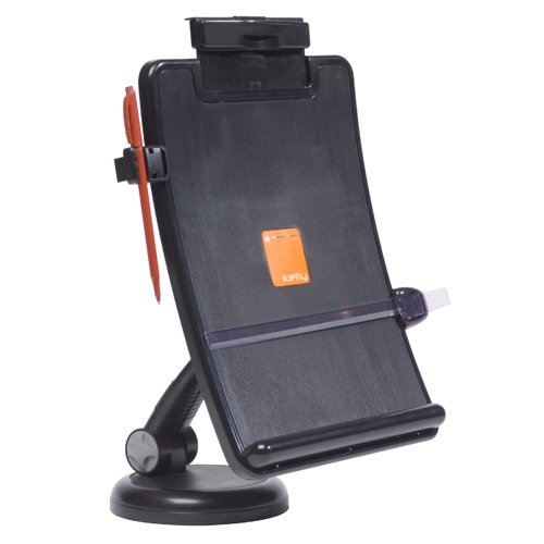 Unique curved tray holds copy in place, reduces overhead glare and improves viewing angles. Weighted base gives great stability. Simple tension knobs easily adjust height, angle and tilt. Smaller side-mounted clip holds stapled documents in place while flipping paper over top of viewing tray. Spring-adjustable, see-through place keeper line guide slightly magnifies text while typing. Spring loaded reversible line guide with slight magnification. Attached pen holder. Holds: Legal; Letter; Mounting: Free Standing; Material(s): Plastic; Sheet Capacity: N/A. Adjustable Magic Curve Copyholder; Kelly Computer Supplies; Typists; Data-Entry; Desktop; Secretarial; Stands